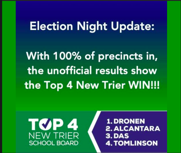 Keith Dronen, Kimberly Alcantara, Avik Das and Sally Tomlinson — the candidates selected by the New Trier High School Board Caucus that were listed first on the ballot — held big leads with all 47 precincts reporting on election night Tuesday, April 6.