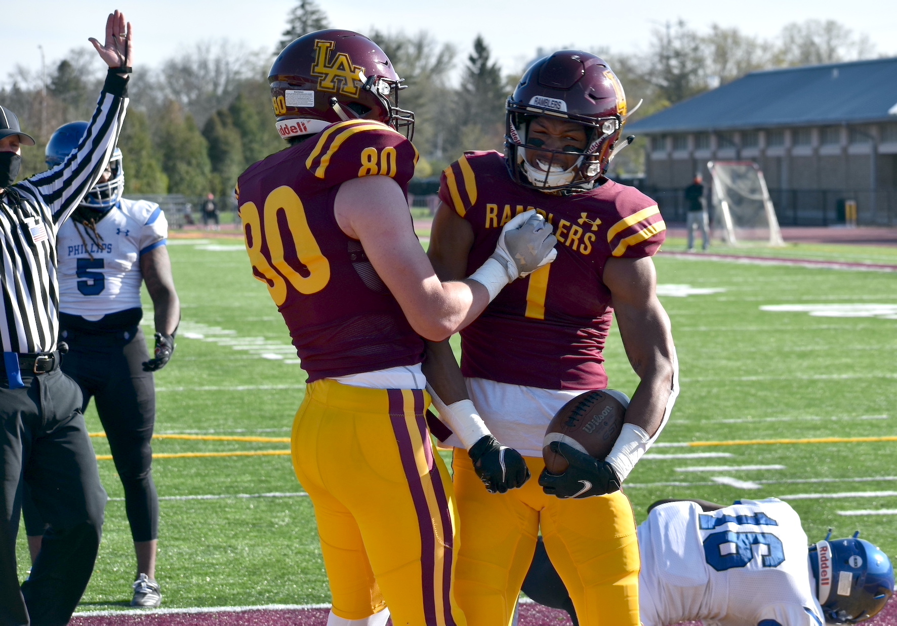 On offense, the multidimensional Ramblers took command after receiving the opening kickoff, driving 74 yards in 14 plays for their first touchdown climaxed by a 22-yard pass from JT Thomas to Perrion McClinton in the end zone.