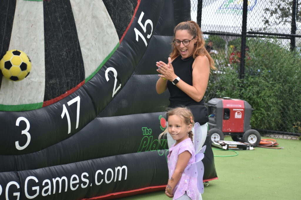 A number of children’s games, like a giant inflatable soccer dart board and inflatable soccer billiard table, were spread across the park’s tennis courts.