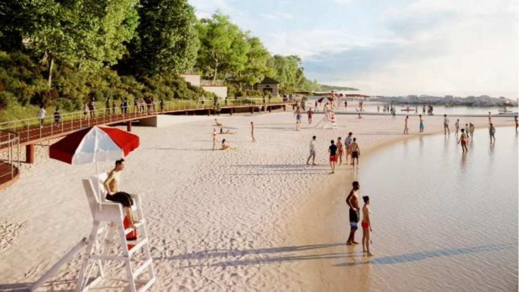 Additionally, breakwaters will curve in on both ends of the perimeters of the combined beach, and a T-shaped pier will split the beaches and extend into the water, ending in a pedestrian “island.”