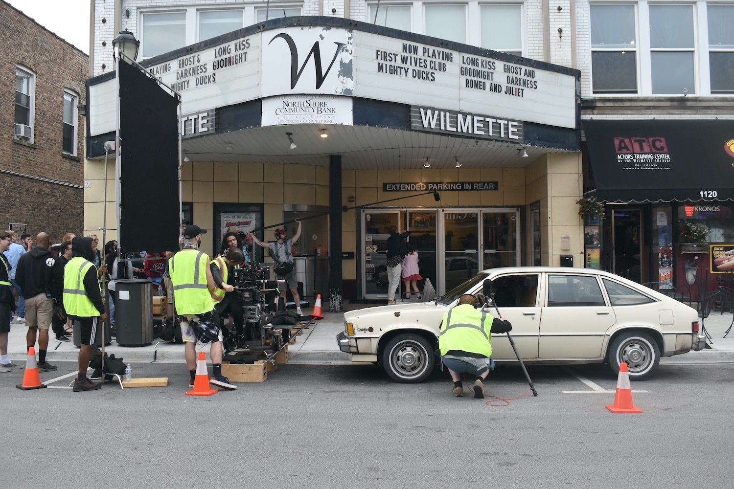 The movie set — anchored by a busted-up Chevy Citation hatchback parked under the theater marquee — caught plenty of attention from the evening crowd in downtown Wilmette. A multitude of onlookers stopped and smiled to enjoy classic filming sights and sounds, like the tracking camera, the clapperboard, “Quiet on the set” and “Cut!”