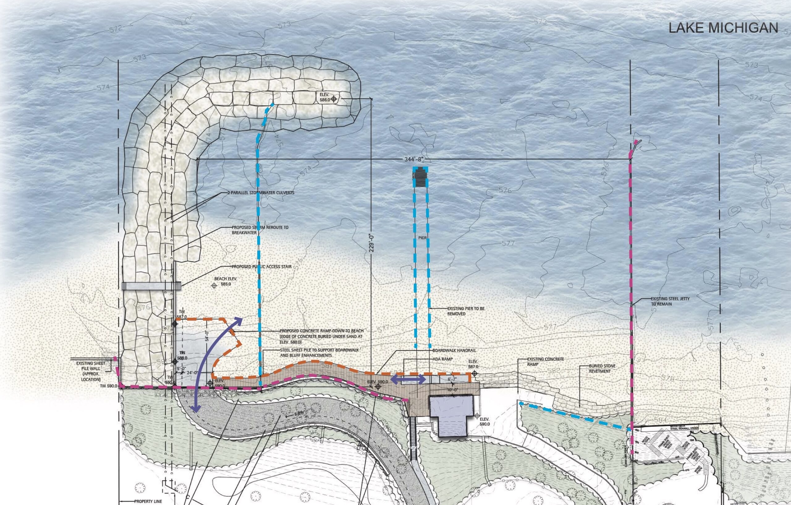 At Elder, the least-elaborate concept is highlighted by bluff restoration, a stone revetment and pier repairs, while possible improvements in the other plans include a stone breakwater stretching into the lake, a new pedestrian path to the beachfront and a boardwalk.