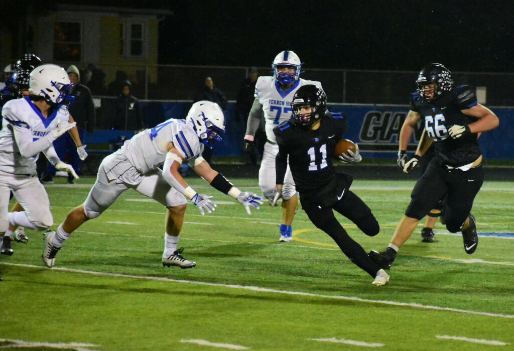 A cold and dreary evening provided the backdrop for Vernon Hills fast start. The visitors gashed Highland Park’s defense early and often, totaling 289 first-half yards that included by eight plays of 14 yards or more.