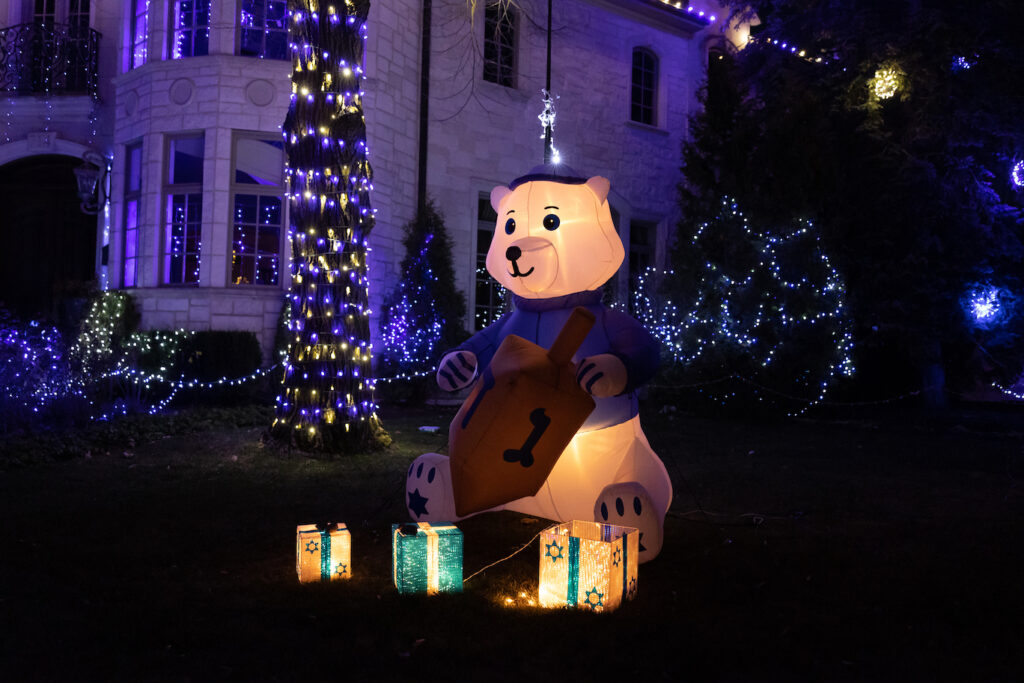 Hazan’s home is bordered with blue and gold lights and speckled with moving dots of more color. Additional lighting shines through each window, and the landscaping is draped with string lighting. More blue and gold lights climb the tree trunks, leading to explosions of blue and gold in the canopy. The yard is outrageous, featuring a lit “Happy Hanukkah” sign, illuminated menorah and several inflatable adornments — from a T-Rex spinning a dreidel to a yamaka-wearing pooch carrying a Star of David.