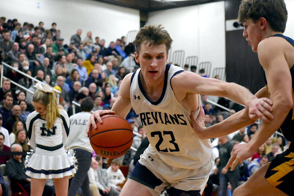 With 1.6 seconds remaining in a tie game, as Glenbrook South defenders drifted toward Fiegen, New Trier inbounder Logan Feller found a wide-open Evan Kanellos cutting to the basket. Kanellos took Feller’s pass and turned it into an uncontested, buzzer-beating layup to give the Trevians a 42-40 victory over the Titans Tuesday, Feb. 28, in a sectional semifinal matchup.