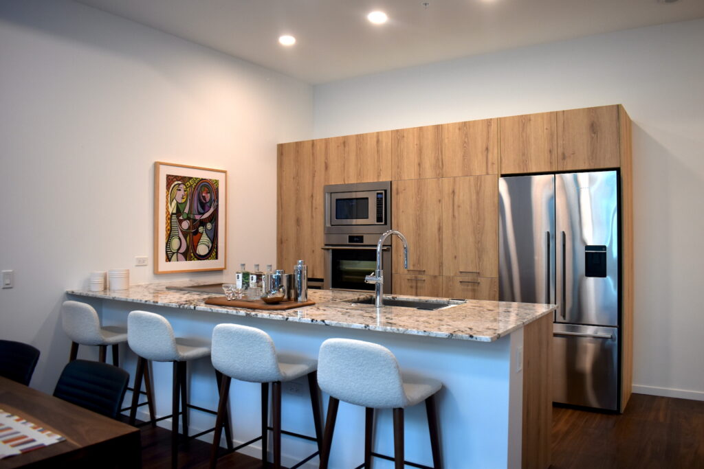 Inside, Optima Verdana’s first floor includes a host of resident amenities, such as a pickleball/basketball court, golf simulator, yoga studio, fitness center, business center, dog park, and interior and exterior lounges. A skydeck — top-floor pool, spa, bocce court, herb garden and more — will be open by August, Burnham said.
