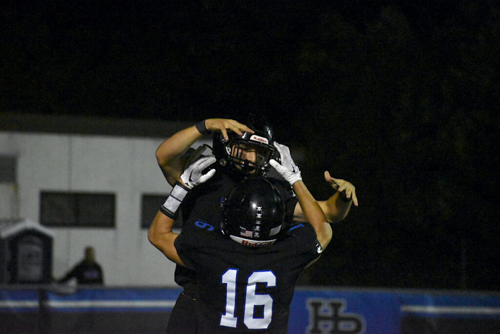 Giants quarterback David Finfer celebrates a scoring run with his teammate on Friday night.