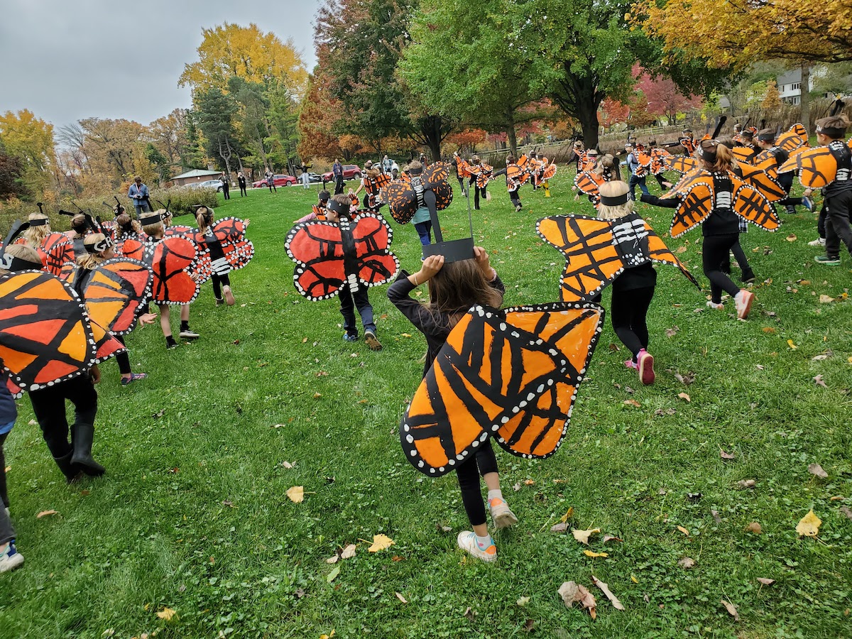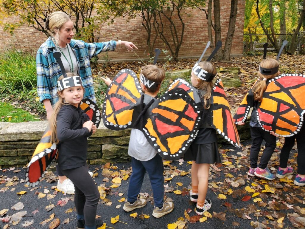 With that enthusiastic chant, a roomful of Crow Island School kindergartners resplendent in black, red, and gold paper butterfly wings attached to their backs, began a journey in and around the school, their route illustrating the monarch butterfly’s own southward migration to the cool Mexican mountains.