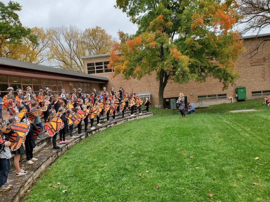 The children snaked single-file around the school building, traveling under trees, the fall colors of which mirrored their wings, and eventually came together for a short but ebullient singing concert, led by music teacher Carey Crows.