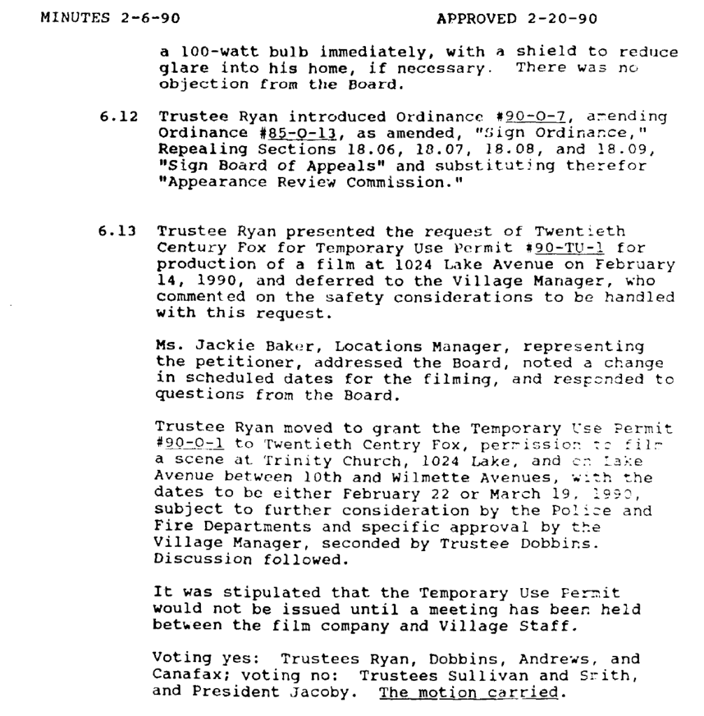 That leniency, however, wasn’t necessarily the case when Twentieth Century Fox approached the Village of Wilmette in 1989 and came in front of the Village Board on Feb. 6, 1990, according to meeting minutes provided by the Village of Wilmette.