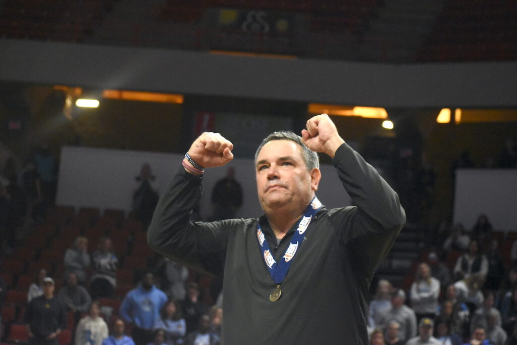 Ramblers coach Jeremy Schoenecker to the crowd after receiving the championship medal.