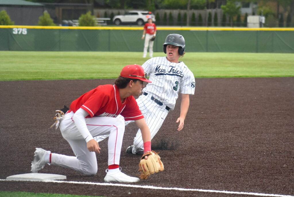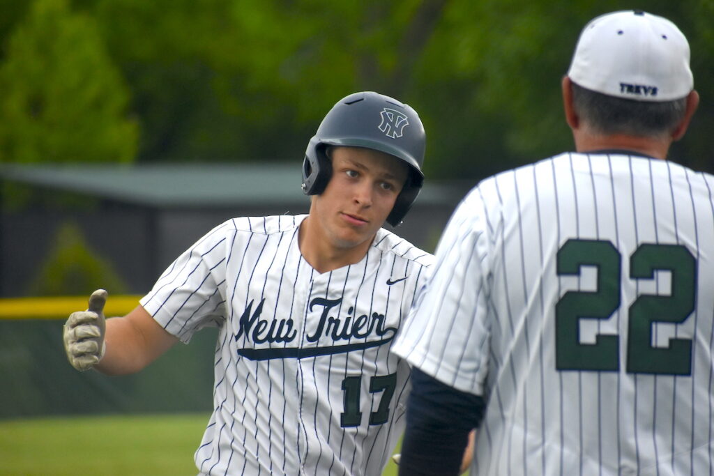 In the sixth inning, Trey Meyers’ run-scoring fielder’s choice scored Jake Bentivenga (2-for-2, 2B, RBI) for New Trier’s fifth run, an important tally as Mundelein’s rally fell just short in the seventh inning.