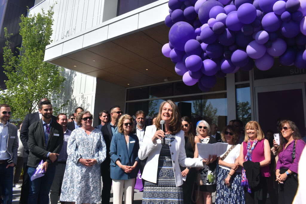 With her turn with the microphone, Wilmette President Senta Plunkett shared her enthusiasm about Wayfair and the economic boost that will come with it.