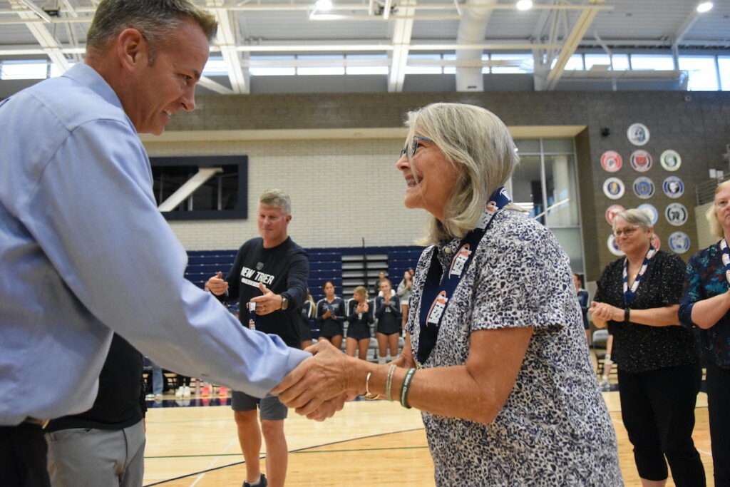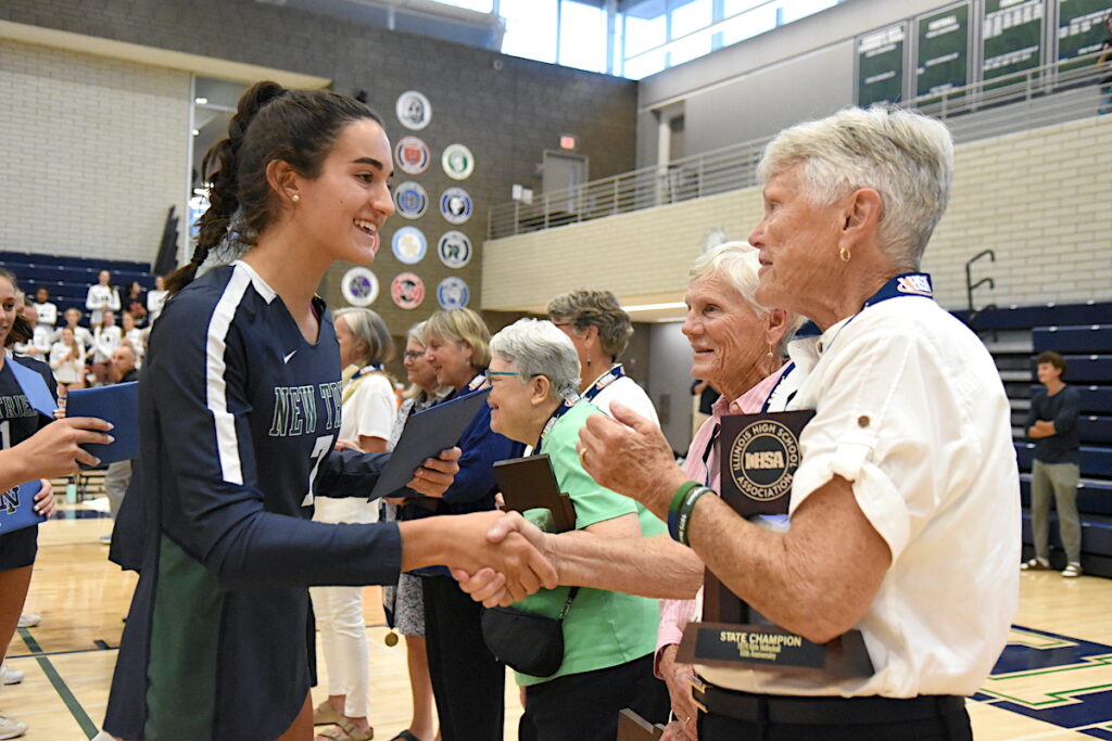 The 1974 team’s head coach Bonnie Beach and assistant coach Lee Kennicke, both of whom are in the New Trier Athletics Hall of Fame, were on hand. Beach said, coincidentally, she and Kennicke helped New Trier hire Augie Fontanetta, now the school’s athletic director, in 1994. She praised Fontanetta, also an IHSA board member, for masterminding Monday’s ceremony.