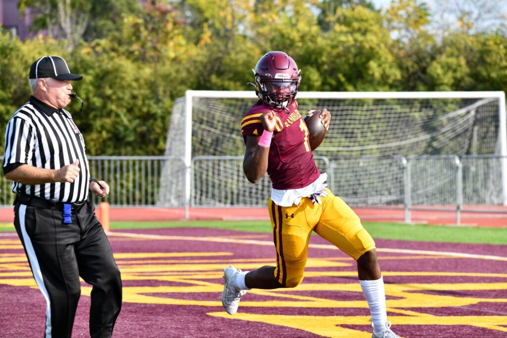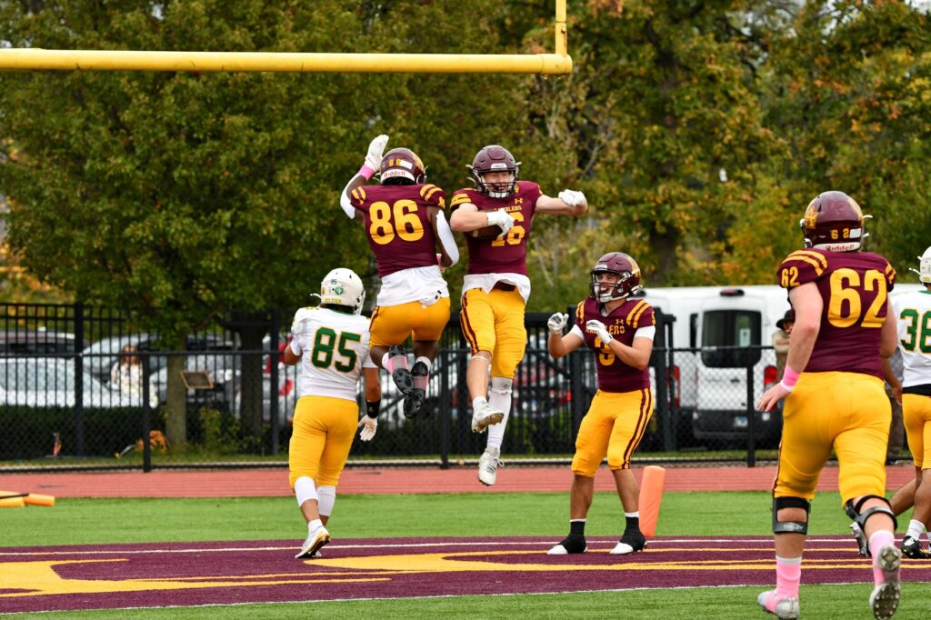 Two possessions later, two rushes by Foster advanced the ball 11 yards and set the stage for Maloney’s 40-yard pass to Carlson for the wide receiver’s second touchdown and the Ramblers’ fifth of the lopsided contest with 6:29 left in the third quarter. Zack Zeman followed with his fifth extra-point kick.