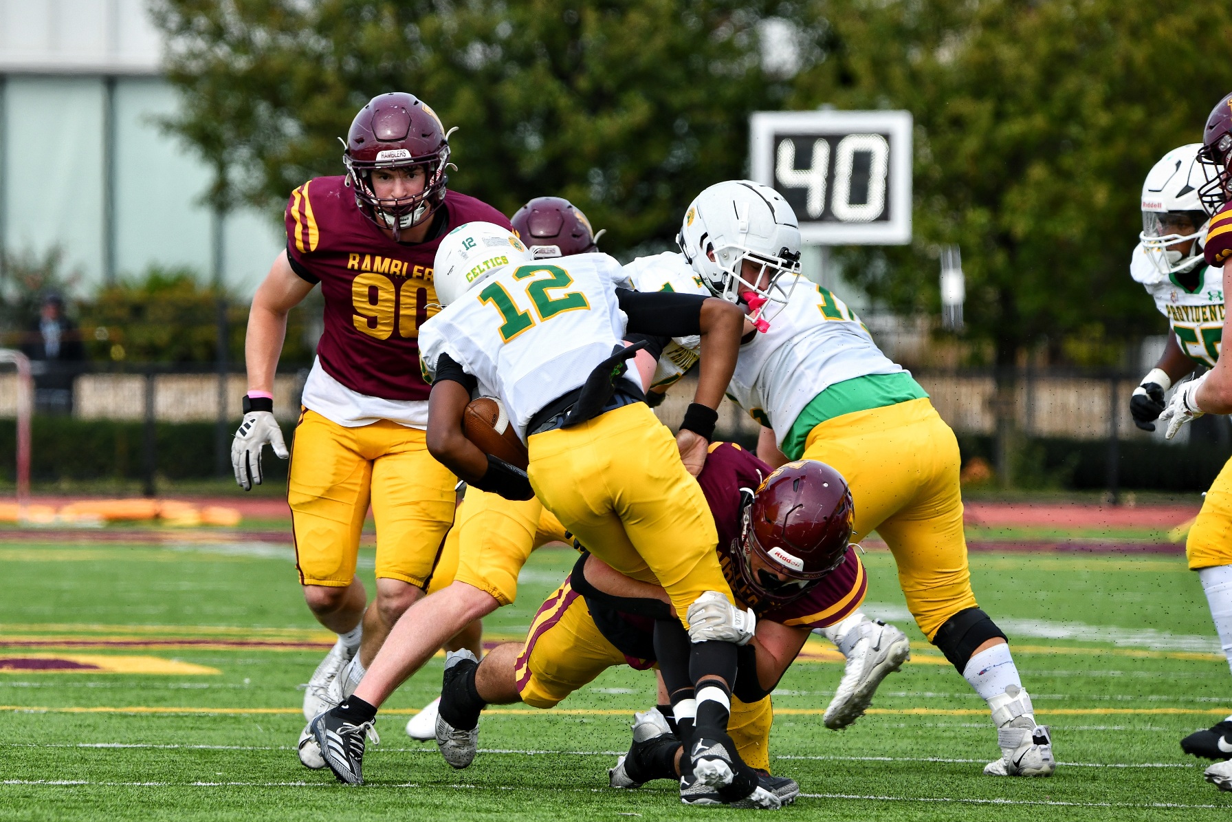 After being unable to capitalize when they started from the Celtics’ 30-yard line on their first possession, the Ramblers reached the end zone on a 47-yard drive in their second possession. MacPherson accounted for 35 of the yards on three receptions and a 4-yard run.