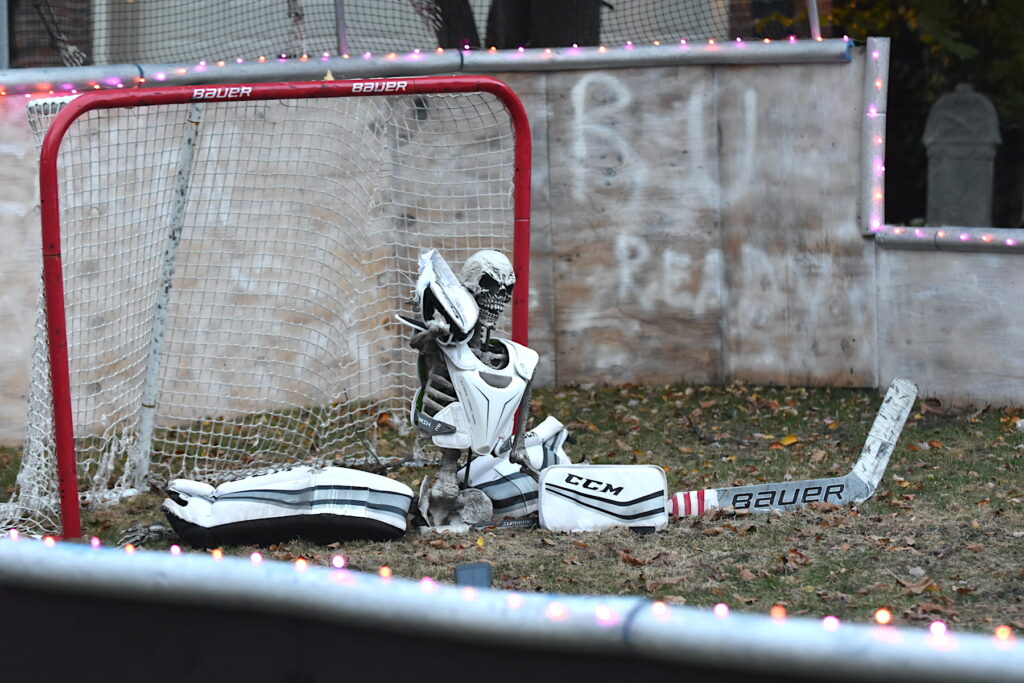 “I think this is the ultimate. … We try to elevate it every year,” she said about the hockey setup, which features skeletons facing off, others in a fistfight, one laying a brutal cross-check and sending an opponent over the boards, another stretched out in full goaltender gear, and three skeleton fans climbing the rink’s netting.
