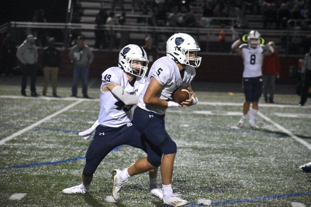 CJ Donnelly hands off to Jackson McCarey for New Trier.