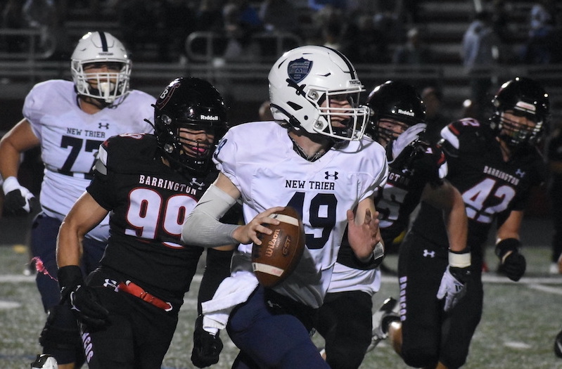 Trevs quarterback CJ Donnelly tries to evade the Barrington pass rush.