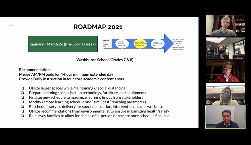 The administration’s recommendation for Washburne is to merge the a.m. and p.m. pods to create a minimum four-hour daily in-person learning schedule.