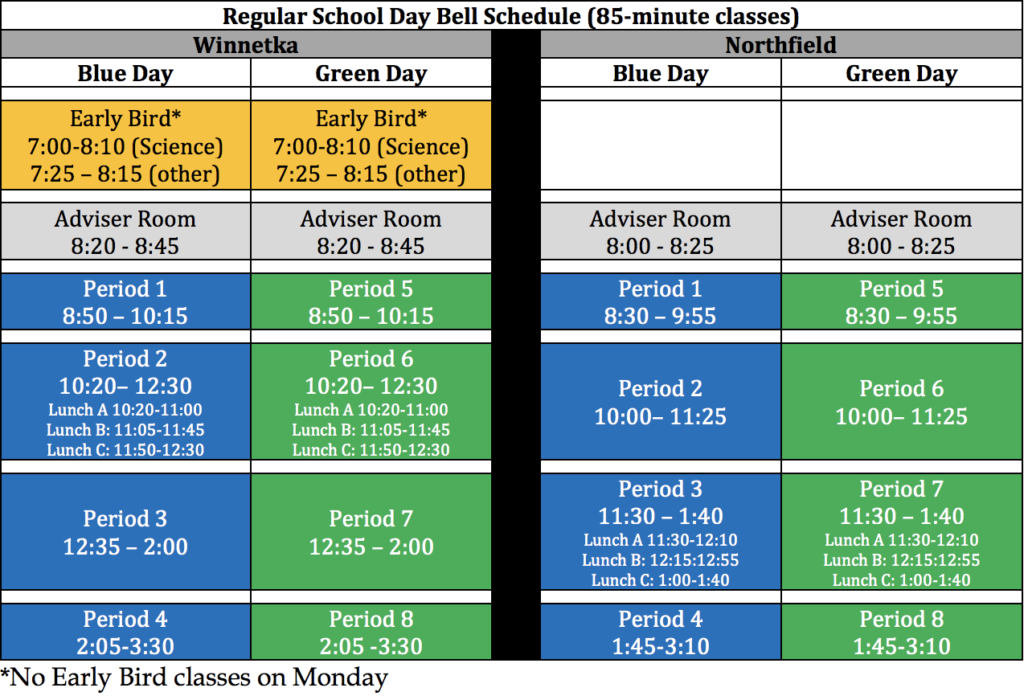 Classes under the current nine-period schedule at New Trier are 40 minutes. Extended class times, which under the proposed schedule change would be 80 minutes every other day for core academic courses, will allow for educators to dive deeper into learning materials in one particular session, officials said.