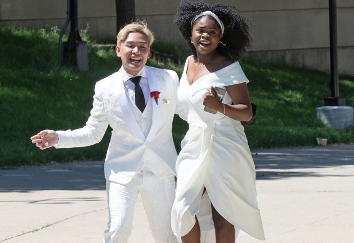 Miguel Alano and Amanda Stringer walk together toward Soldier Field before the start of commencement May 30 in Chicago.