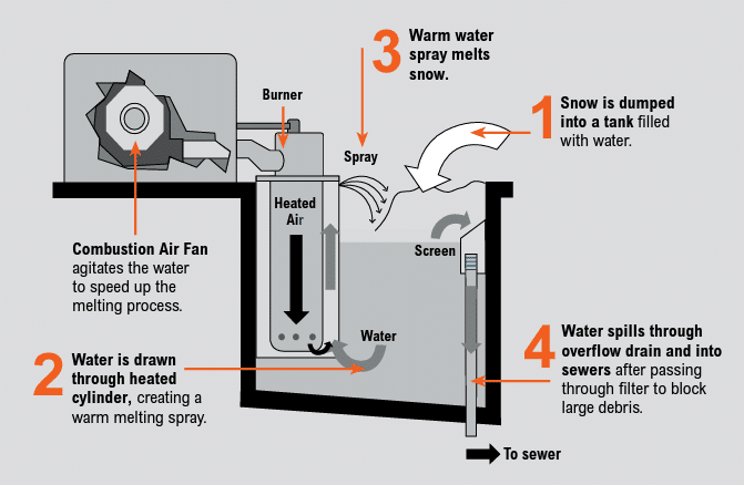 According to the Trecan website heavy-duty snow melters, which are commonly deployed by airports, use warm water to melt large quantities of snow. Snow is bulk dropped into the machine’s tank, which is filled with water warmed to about 80 degrees by an independent burner. A combustion fan “agitates” the water to accelerate the melt. The resulting water is sent through a filter and out of the machine via an overflow drain.