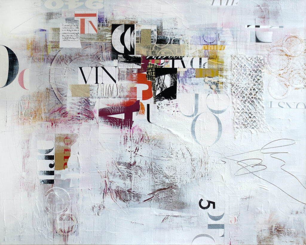 For “White Impressions,” Weber picked five limited color combinations and created two of each combination. Wanting an overall white atmosphere with color and texture coming through, she used a multi-layered process of painting and mark-making and experimented with a variety of brushes and tools. She collaged in typography (a nod to her design background) and “whited” over the canvas, creating abstract pieces with a contemporary feel.