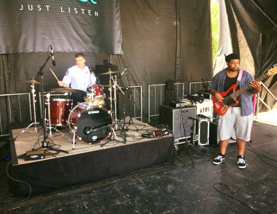 Marc Hornstein (left) puts one of his hobbies on display during soundcheck at the 2018 Winnetka Music Fest.