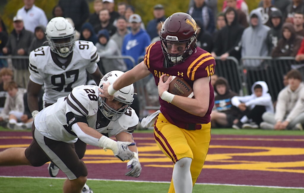 Six seconds into the fourth quarter Elliott’s 28-yard pass to Densmore followed by Elliott’s run for a two-point conversion slashed the Ramblers’ lead to 23-15 and set the stage for their game-saving defensive stand in the closing minutes.