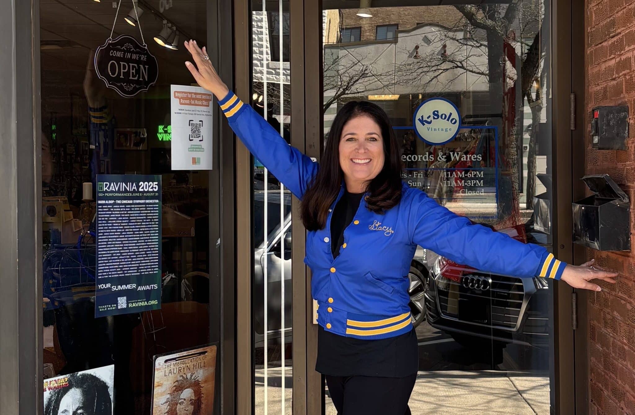 A 1980s-style bomber jacket in a shiny royal blue with gold-yellow buttons, trim and “Stacy” embossed on the front caught the eye of K-Solo Vintage co-owner Taryn Fisher nearly six months ago, likely at an estate sale. She displayed it proudly at her Highland Park store.
