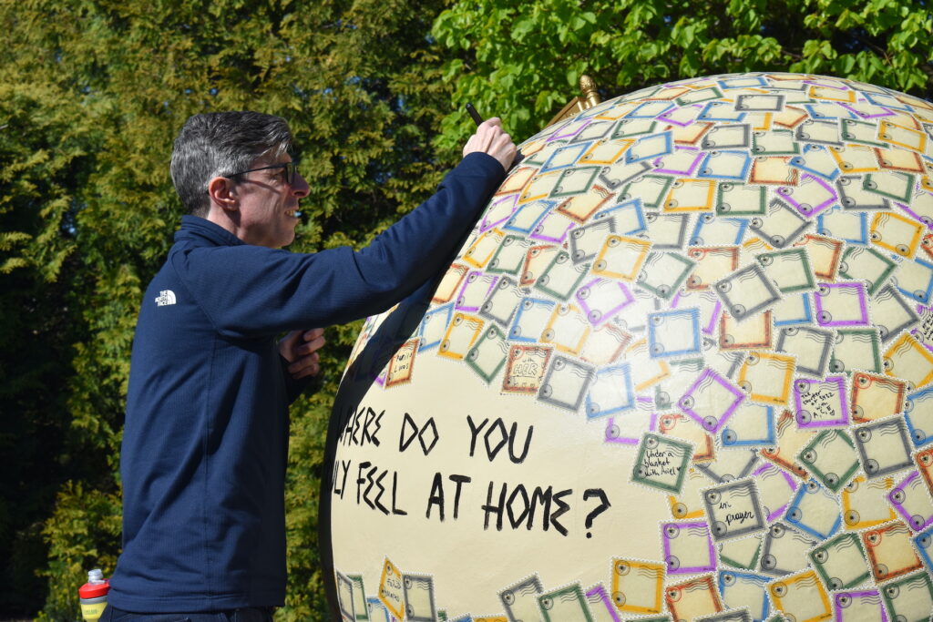 “This is a big, big globe filled with stamps, so you can go choose your stamp and answer, Where do you truly feel at home?” Goya said to the crowd surrounding the art.