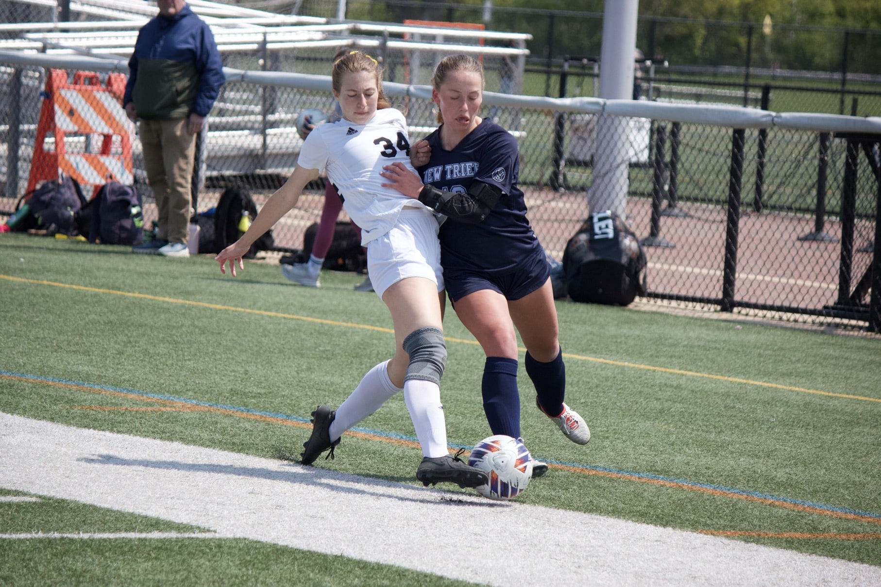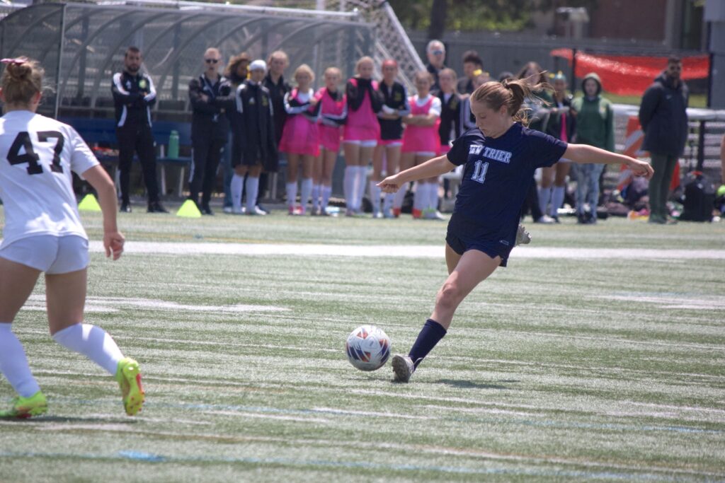 The match’s opening minutes saw the teams trade threats on goal but neither found a finishing touch. New Trier goalkeeper Annie Fowler thwarted a Lane attack in the ninth minute with a strong save, and the Trevs put forward a solid chance of their own in the 12th minute but sent an attempt just wide.