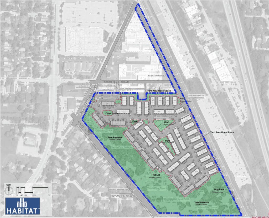 Accommodating other feedback, the current development plan includes 53% more trees than required by code, multiple townhome color schemes and facade types, a 1,430-linear-foot public access walking trail through preserved wetlands and added parking for industrial businesses on Richfield Road according to The Habitat Company.