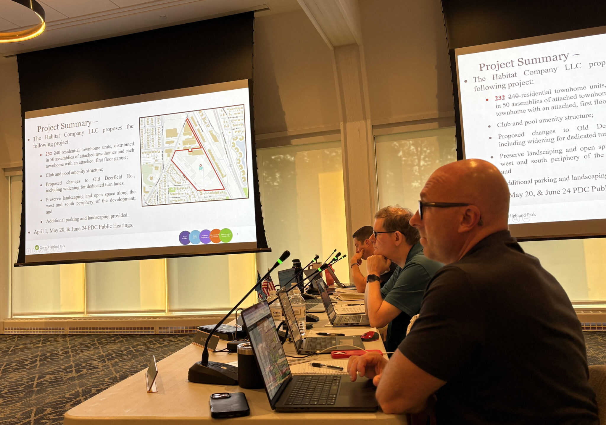 Highland Park city officials gathered Tuesday evening to review the latest plan for a 232-townhome residential community planned for the former home of the Solo Cup Company facility.