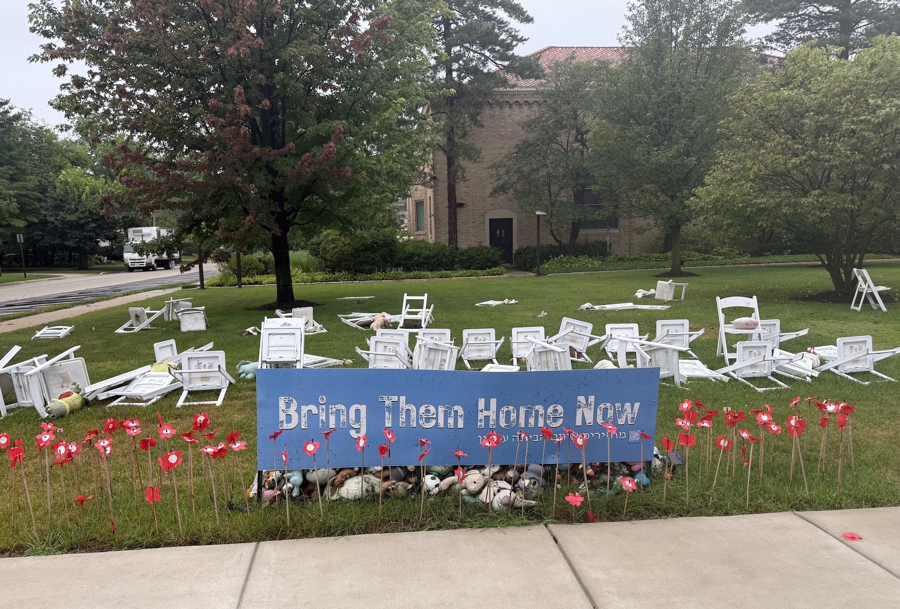 Am Shalom established the tribute in response to the Oct. 7 attack. It originally featured 248 white chairs, each one representing a captive, fronted by a banner reading “Bring them home now.”