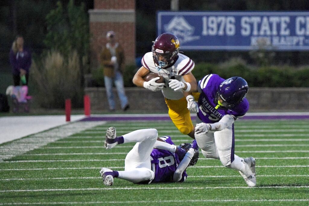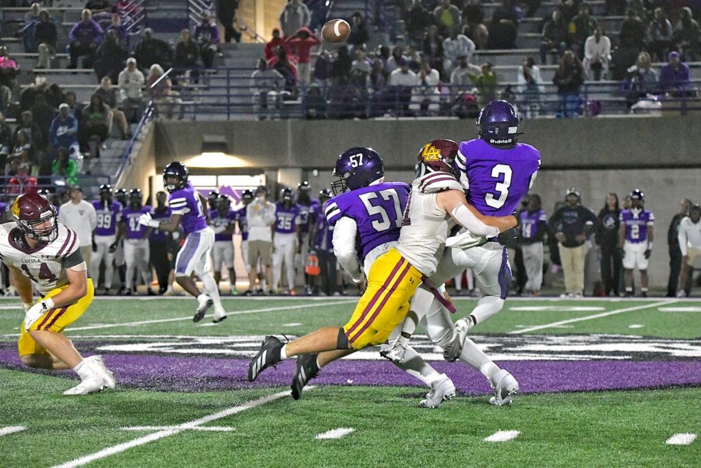 Loyola’s Will Mettee hits Merrilleville quarterback Michael Hill in the season opener.
