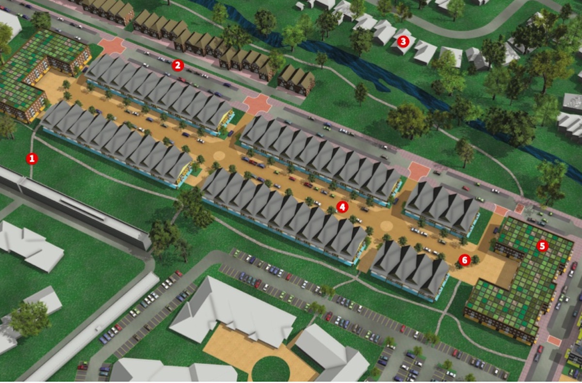 A rendering in the comprehensive plan shows a small street surrounded by buildings and a path that leads to the Village Center.