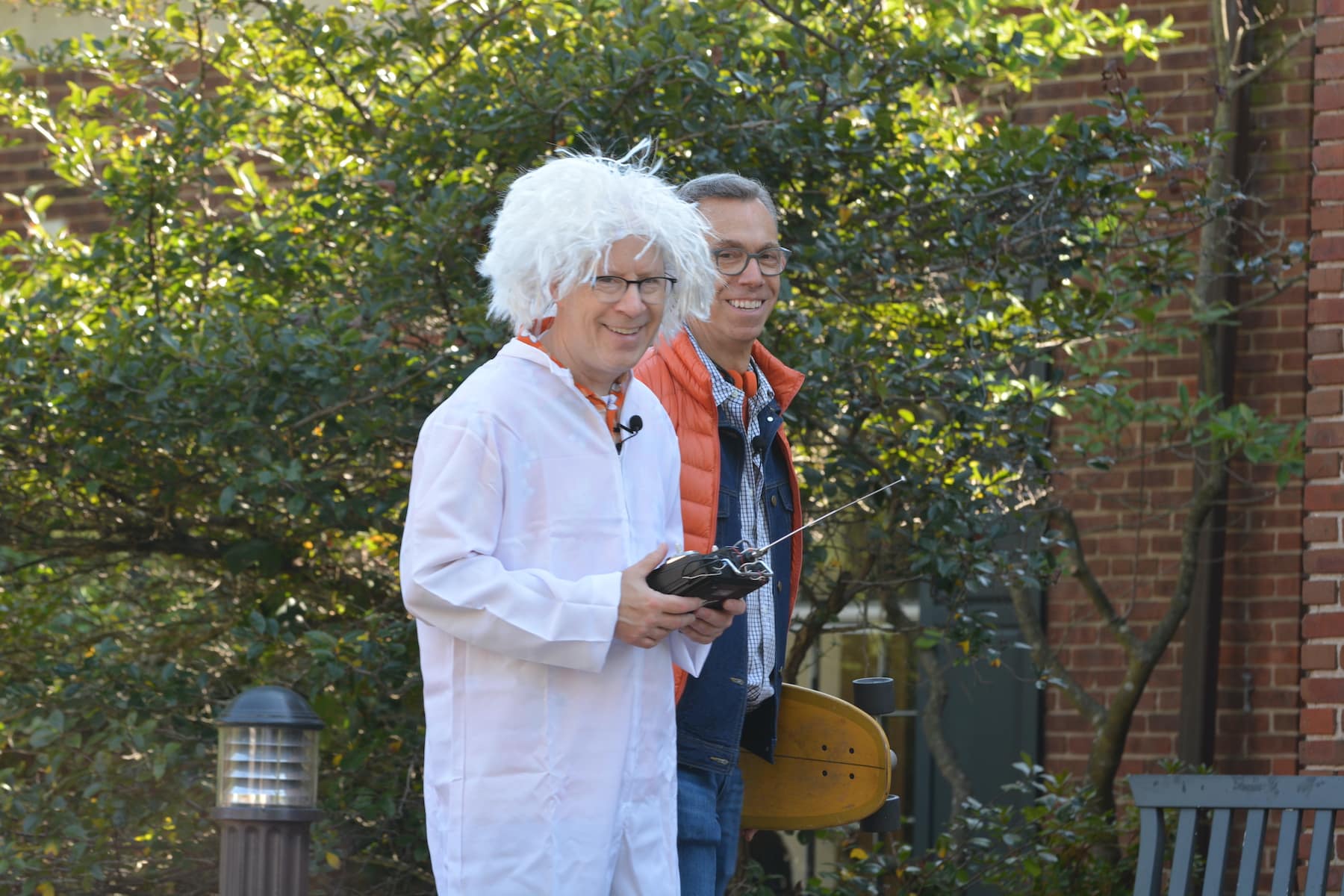 Steve Monieson, as Marty, and Steve Miller, as Doc, were filmed inside and outside the Glencoe Public Library, because Funny Enough’s new show will raise funds for library renovations — a $17.3-million project known as Rooted in History, Building for Tomorrow.