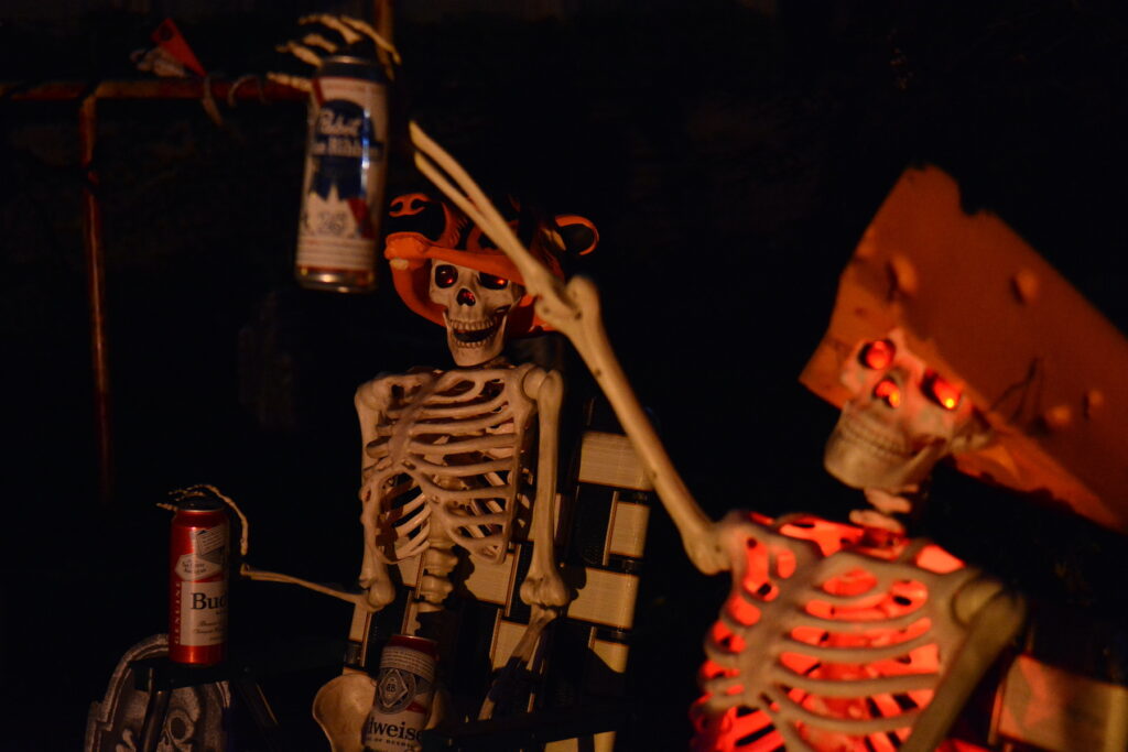 While other skeletal players are tussling in the background, a group of fans is field-side enjoying a barbecue. One of them sports a cheesehead and a PBR, another a Bears hat and a Budweiser.