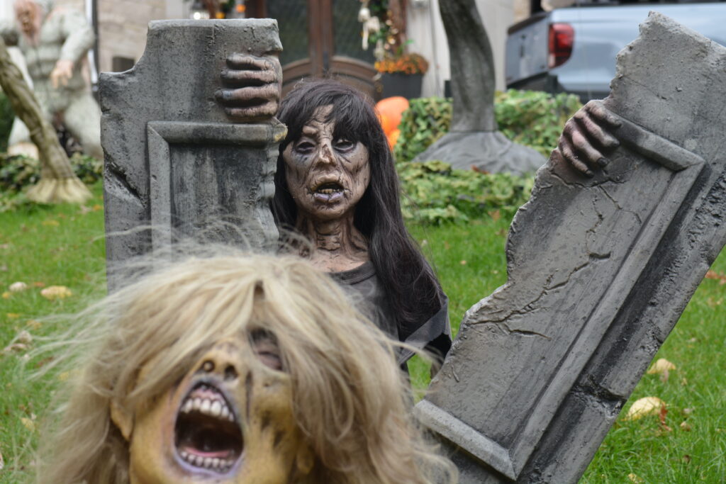 The 20-foot demons and ghouls are quite a site as you approach the manor, but explore a bit. With so much happening, the yard is broken into themes, like the graveyard, the clowns and the zombie pumpkins.