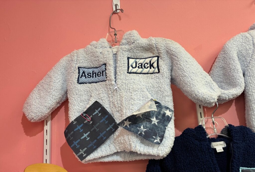 Local moms do the custom monogram embroidery with a choice of background on these warm baby sweaters priced at $48 plain and $68 with the child’s name. Baby Dreams in Highland Park also offers a house brand of leggings and comfy apparel for young ones. It also takes orders for delivery.