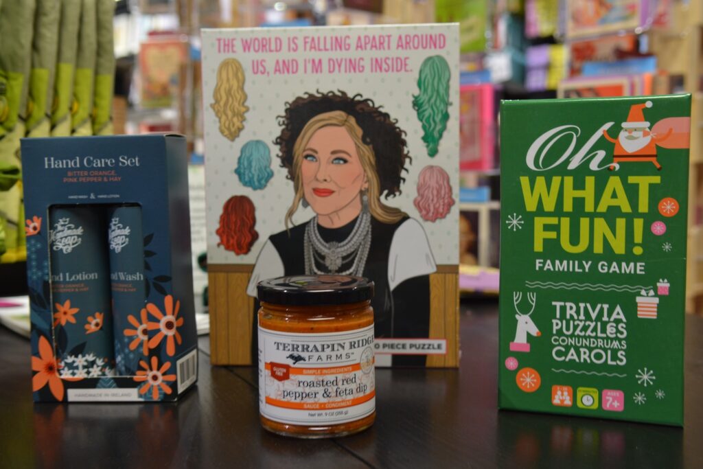 Puzzles are in and in a big way. A 500-piece puzzle ($24.95) featuring beloved “Schitt’s Creek” character Moira Rose is one of numerous unique, clever and (at times) irreverent gifts you’ll find at this shop in downtown Wilmette. Co-owner Matt Lambrecht said other items flying off shelves include Terrapin Ridge Farms dips ($9.95), a hand-care set from Handmade Soap ($38) and family games like “Oh What Fun!” ($19.95).