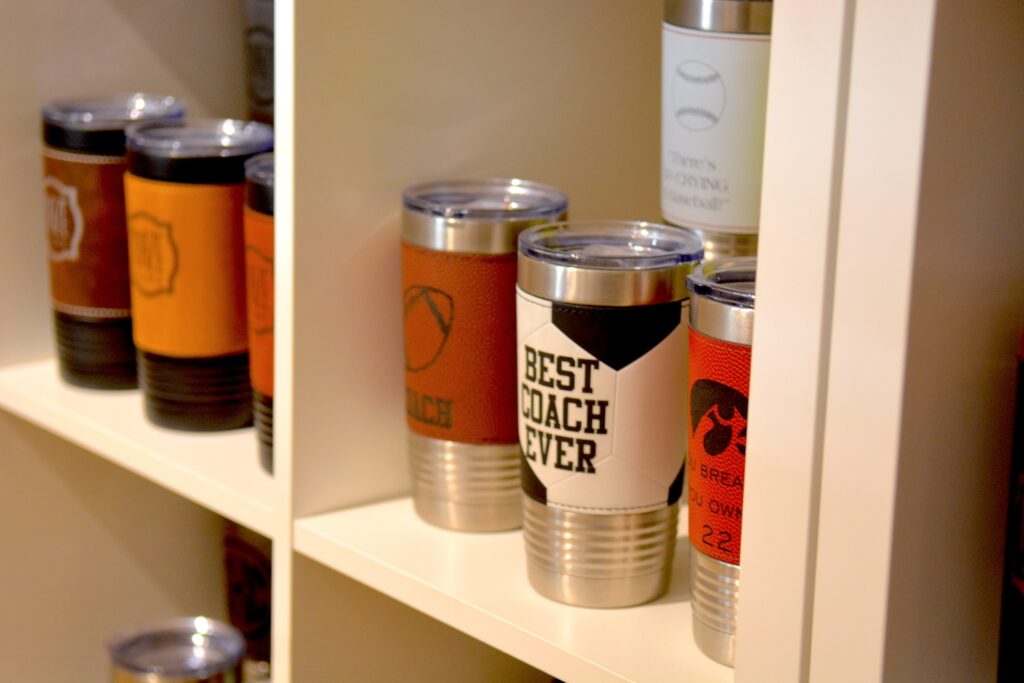 Just like Maze is tucked in a storefront just off Winnetka’s Lincoln Avenue drag, its customization station is tucked in the shop’s corner but has plenty to offer, including on-the-go drinkware. The options are plentiful at $25-$35 and you can add your own touch whether it’s for your “No. 1 Dad,” “World’s Best Mom” or “Coach of the Year.” Customizable coasters and glassware are also available.