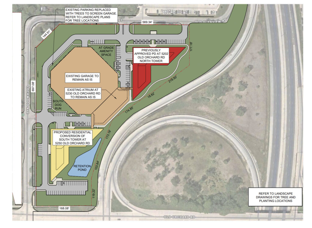 The Village Board originally voted in April 2024 to approve a petition from a different developer, Zeller OOT, to convert the two mostly vacant seven-story office buildings at 5202 and 5250 Old Orchard Road into an apartment complex with 245 units.