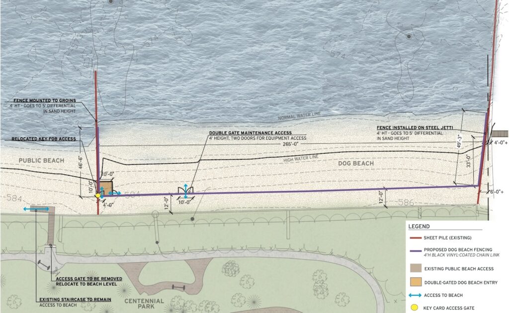 Ultimately, the Park Board voted in favor of proceeding with a plan that includes a 46% reduction of the size of the off-leash dog beach area (from 490 feet to 265 feet) and the relocation of the fencing. The north-south border fencing is now planned for the top of the existing steel groins and jetties to use “an already existing barrier into the lake instead of creating new barriers,” Kutulas said.