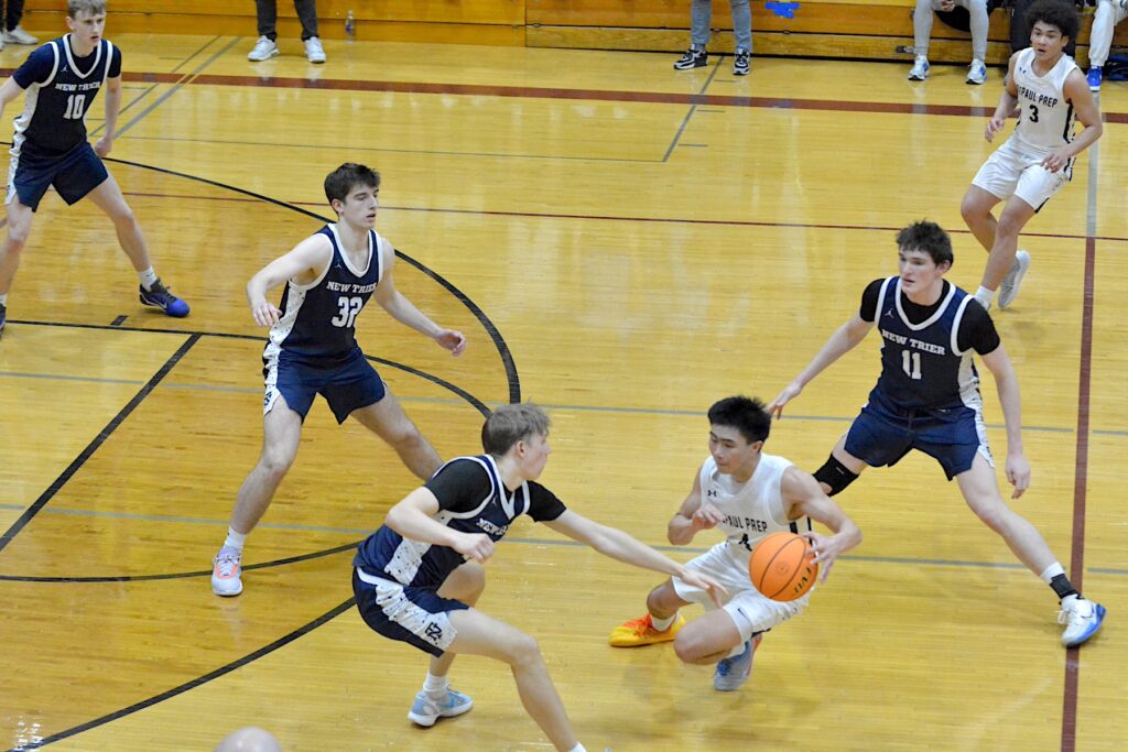 New Trier’s (left to right) Max Vogel, Elton Jaegerskog and Matthew Logue pressure DePaul’s Rykan Woo.