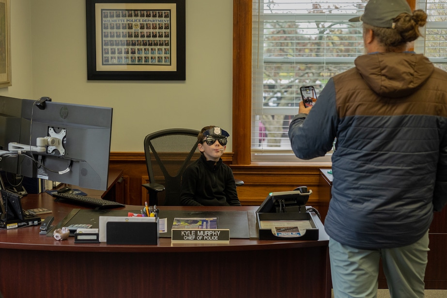 Reilly Depp, 8, of Wilmette, sits in the chief's chair during the Wilmette Police Department's open house on Sunday, May 1.
