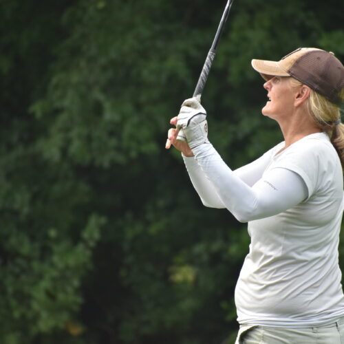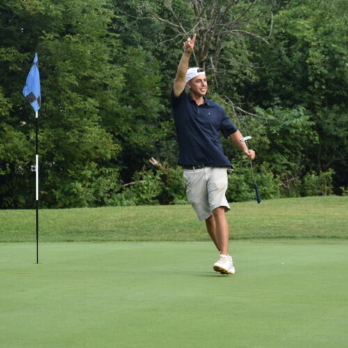 Julie Saltzman celebrates sinking a putt during The Record North Shore's inaugural golf outing in August at Chick Evans Golf Course. | Photo by Joe Coughlin