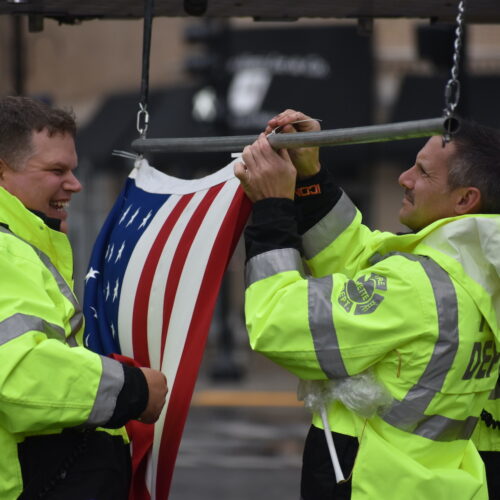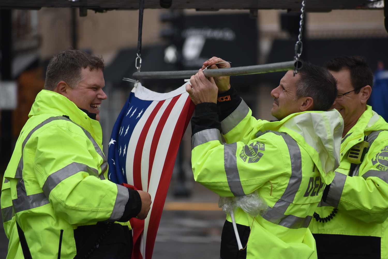 Wilmette firefighters attach a U.S. flag to a ladder truck during Wilmette's ceremony Wednesday, Nov. 11.